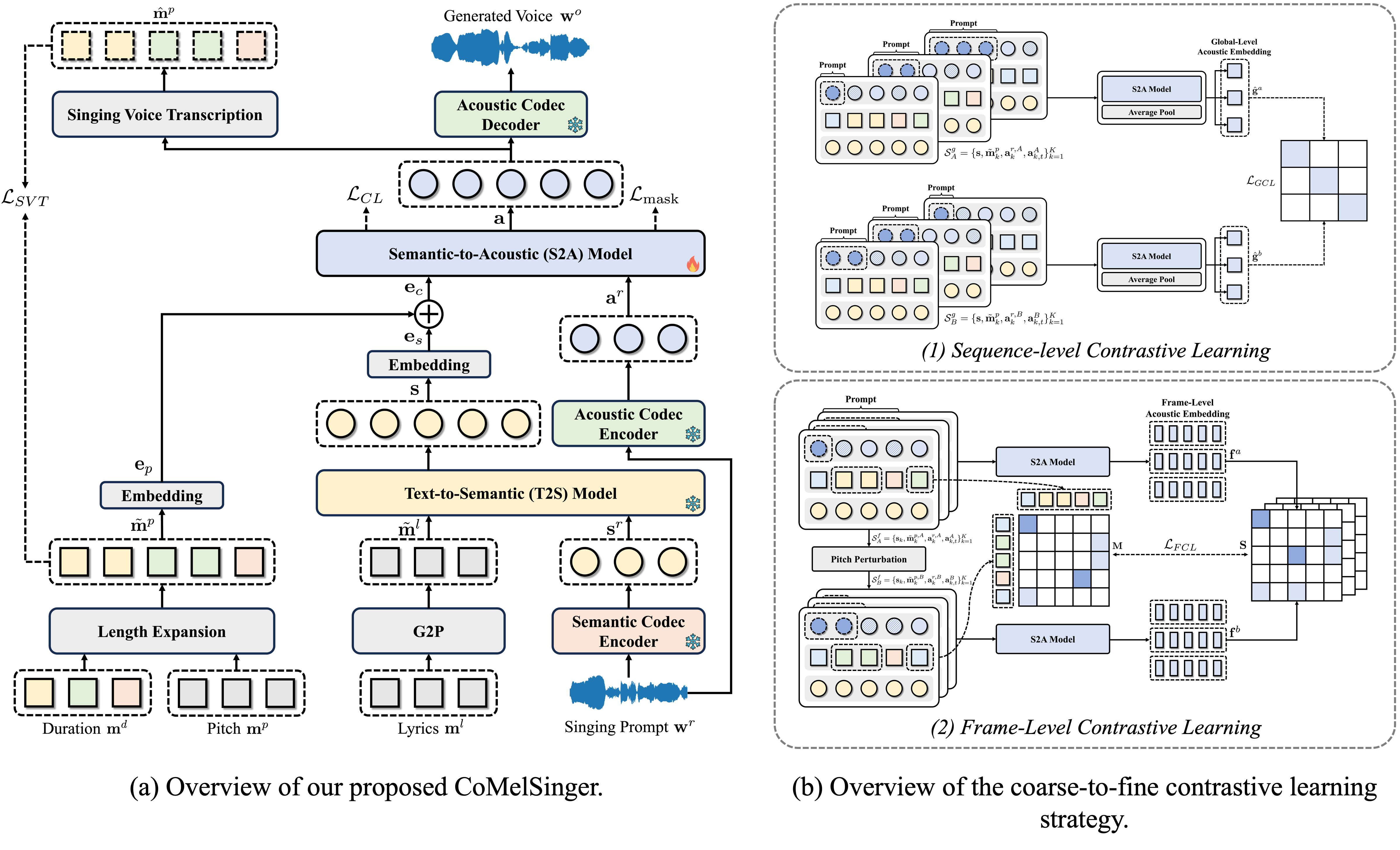 Overview of CoMelSinger (left). It adopts a two-stage pipeline: a T2S model encodes lyrics into semantic tokens, and an S2A model generates acoustic tokens conditioned on lyrics, pitch, and prompt. SVT provides pitch supervision. All modules except S2A are frozen during training. Overview of the coarse-to-fine contrastive learning strategy (right). (a) Sequence-level contrastive learning encourages timbre consistency across different melodies. (b) Frame-level contrastive learning uses pitch perturbation to enforce local pitch-awareness and disentangle melody from timbre.